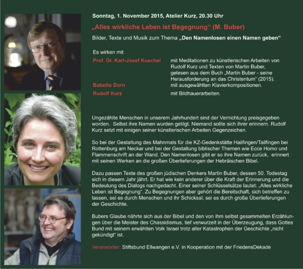 Es wirken mit: Rudolf Kurz mit Bildhauerarbeiten, Prof. Dr. Karl-Josef Kuschel mit Texten aus seinem Buch "Martin Buber - seine Herausforderung an das Christentum", Babette Dorn mit ausgewählten Stücken am Klavier.